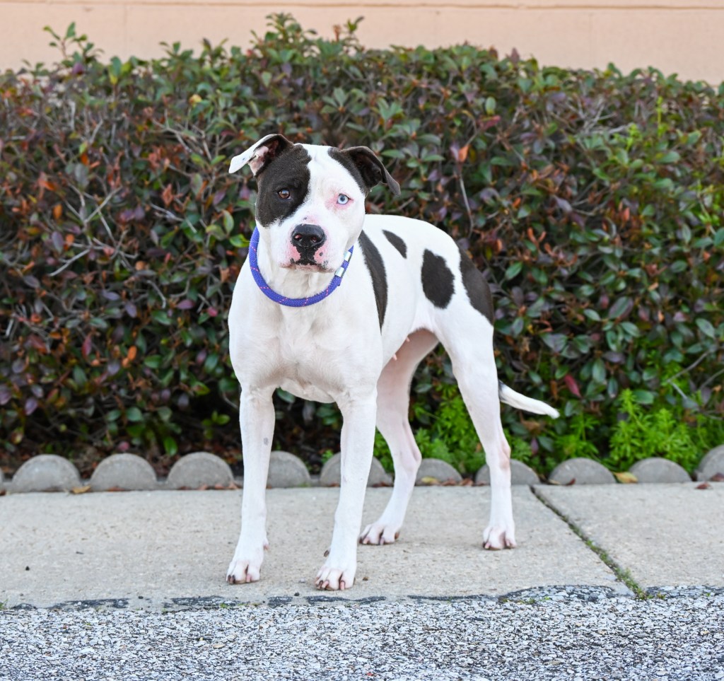 Meet Annie– a one-and-a-half-year-old black and white pit mix with the coolest eyes—one brown, one blue, and both ...